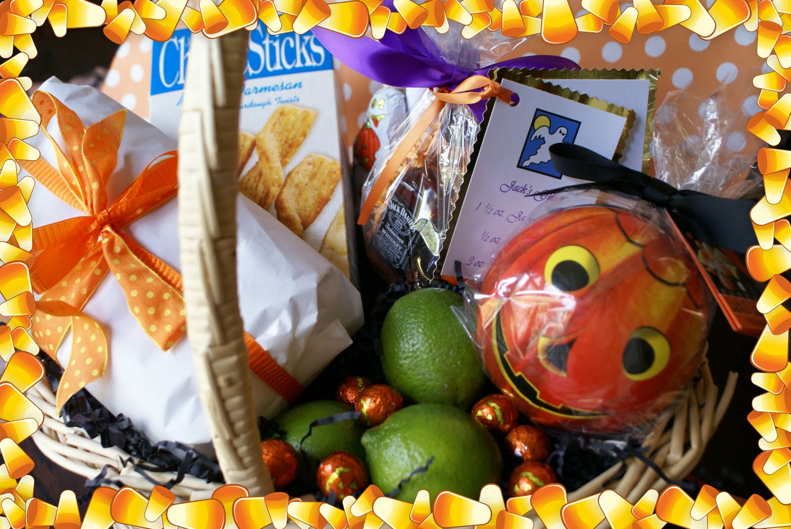 One recipe calls for fresh lime juice so I added limes to the basket. On my way out tonight I’m stopping at the store and picking up POM to slip into the basket too. In goes the paper mache ball I found at William’s-Sonoma filled with candy and I tossed in some See’s milk-chocolate pumpkin balls and a ghost.